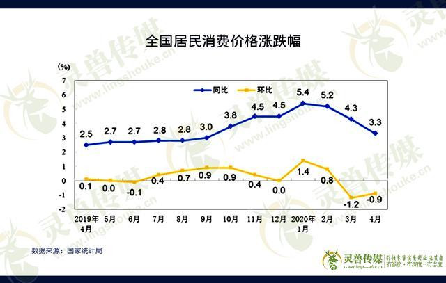 4月份CPI同比上漲3.3%。其中食品價格上漲14.8%,非食品價格上漲0.4%;消費品價格上漲4.7%,服務價格上漲0.9%。