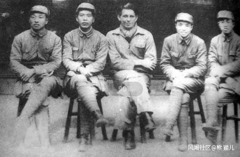 1945年2月,浙東遊擊縱隊的領導和美國飛行員托勒特(中)中尉合影。
