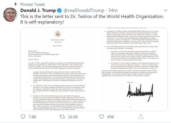 美國當地時間18日,美國總統特朗普在社交媒體推特上分享一封寫給世界衞生組織總幹事譚德塞的信,威脅要永久切斷美國對世衞組織的資助。