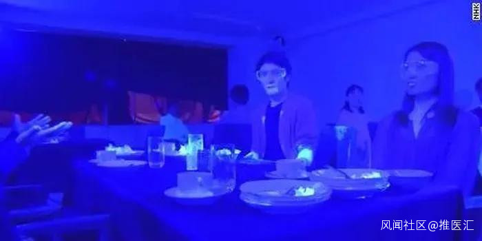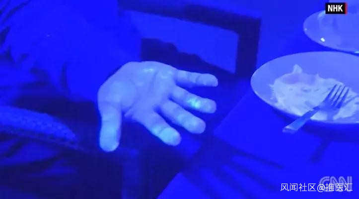 在用餐半小時過後,參與者被投射在黑光燈下,“被感染”的地方會被熒光照亮。 實驗結果顯示,手上的“病毒”快速擴散,不僅沾到了“感染者”的嘴邊,而且擴散到餐盤桌子杯子上。此外,同桌的其他食客也粘上了不同程度的“病毒”。
