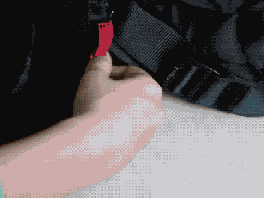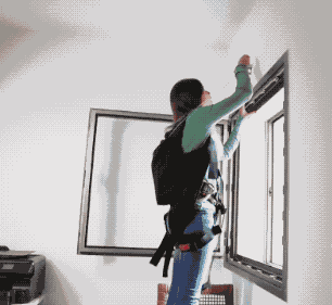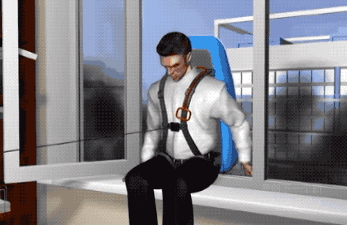 然後坐在窗户邊,用力拉下揹包上的充氣啓動環,揹包就會立刻打開充氣,變成一個保護墊。