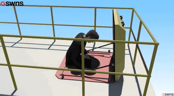 當遇到火災或其他災害時,只要打開“井口”,站在這塊液壓式逃生電梯上,用腳踩下踏板按鈕,它就會自動下降到下一層。