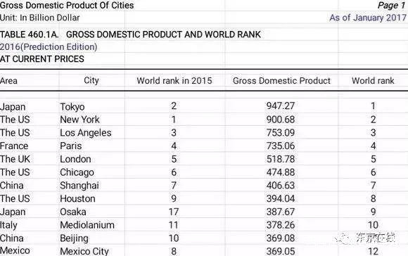 ▲ 2016年全球城市GDP排名,東京一度衝上第一名的寶座