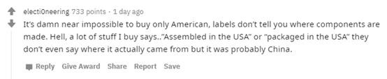 這一調查結果也在美國的社交網絡上引起了一些關注。在美國的社交網站 Reddit 上,多數美國網民就表示美國人很難不去購買中國貨,並認為那些宣稱自己不會去買中國貨的人只是在 " 耍嘴炮 “。有美國網民還指出,現在美國的一些商家也挺 " 精 " 的,就是他們會在網上宣傳他們的產品時,標上諸如 " 在美國組裝 "” 從美國發貨 " 等説法,讓人們以為這些產品是真正的美國貨,可當你拿到這個產品時,就會發現這裏面有很多零件都是中國產的。