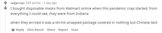 一位網民甚至表示,他前不久在美國沃爾瑪網購了一個看起來很像是美國印第安納州自產的口罩,拿到後卻發現包裝上寫着中文 ……