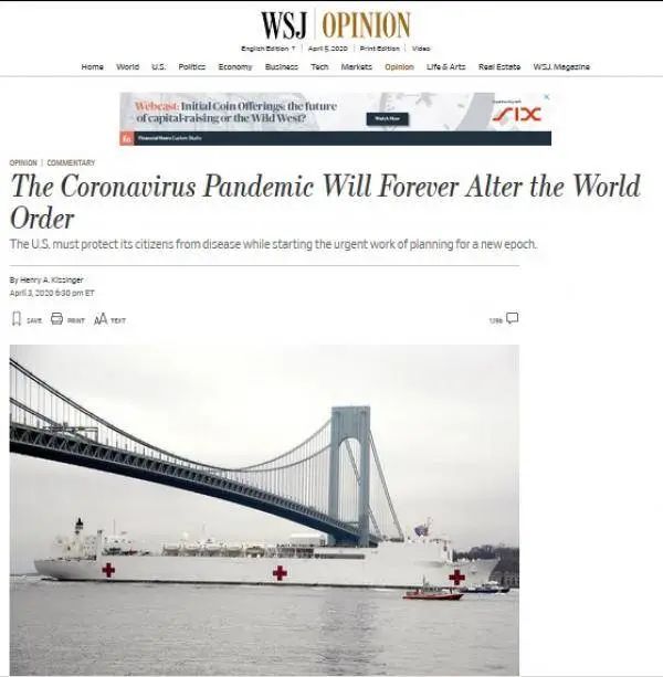 基辛格,“新冠大流行將永遠改變世界秩序”,截圖來自華爾街日報