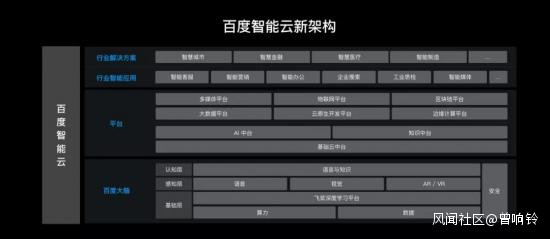 剛剛進行的百度雲智峯會上,百度智能雲發佈了其“新戰略”——“以雲計算為基礎,以人工智能為抓手,聚焦重要賽道”,和“新架構”——百度大腦、平台層、行業智能應用及解決方案三層結構。