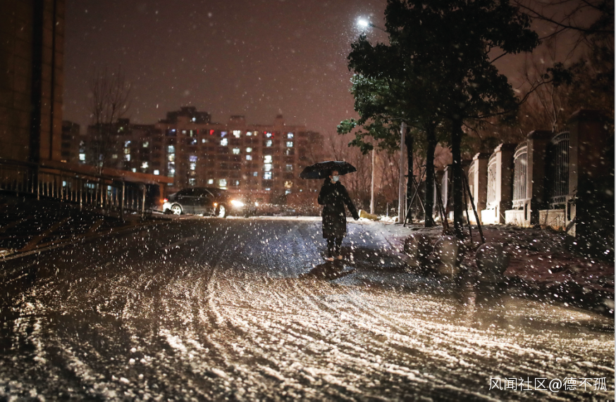 漫天風雪中,一個瘦弱的身影撐傘而行,身後的路燈照亮了點點飛雪——那是他們在夜以繼日地輪替工作;