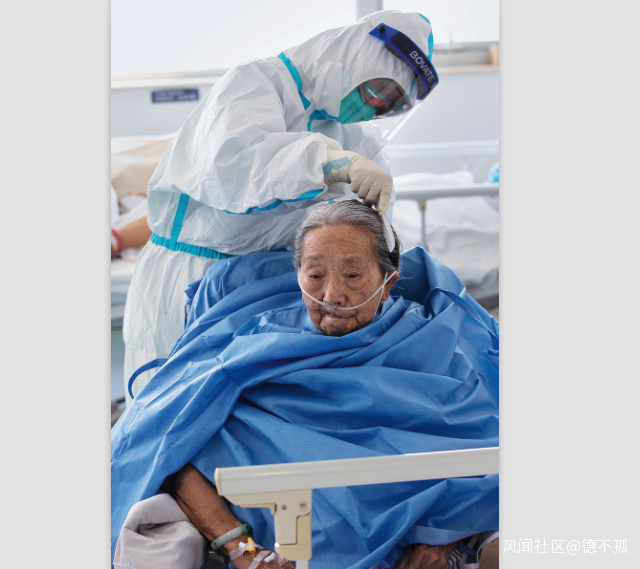▲2020年3月18日15:54,武漢大學人民醫院東院22號病區,護士長鄭吉莉為85歲的趙金香老人梳理頭髮。(賴鑫琳 攝)