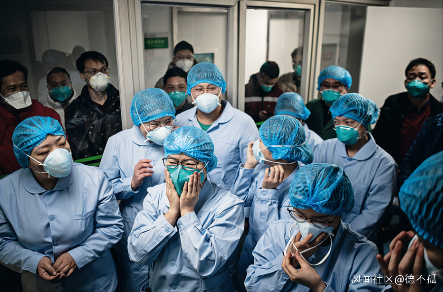 在醫院病房,一位護士連續工作8小時候後,脱下口罩,口罩的紋路深深地印在了她的臉龐上——那是他們為了同胞而忘我工作;