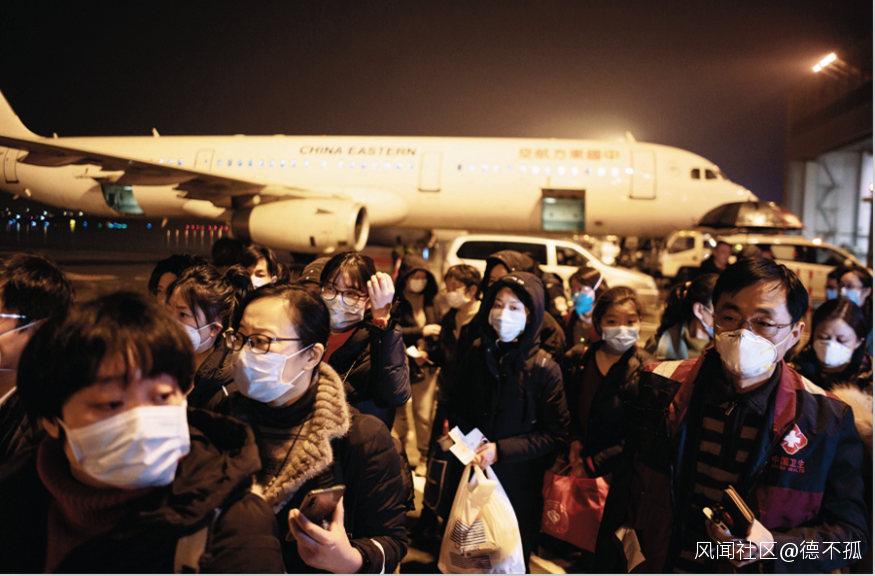▲2020年1月24日23:06,第一批上海支援湖北醫療隊隊員走下襬渡車,準備登機。這晚天氣寒冷,是中國農曆的大年三十。(董天曄 攝)