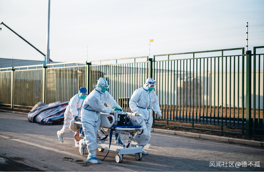 ▲2020年2月17日17:30,雷神山醫院,三名醫護人員為了搶救一名生命垂危的病患,穿着笨重的防護服在夕陽下奔跑。(董天曄 攝)