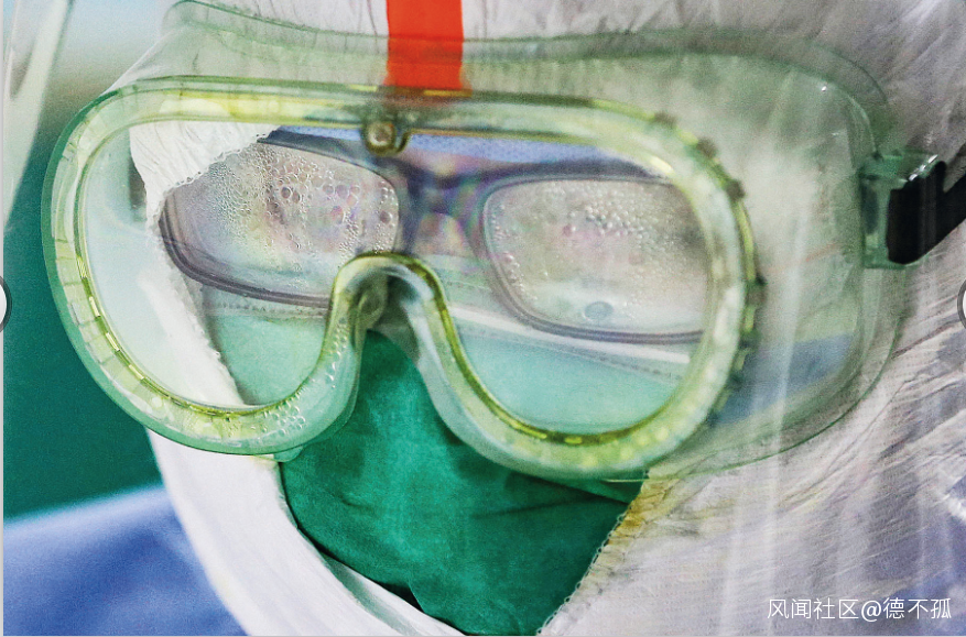 ▲2020年2月12日23:43,武漢市第三醫院,護士史媛虹的護目鏡上佈滿了水珠,嚴重影響視線。(賴鑫琳 攝)