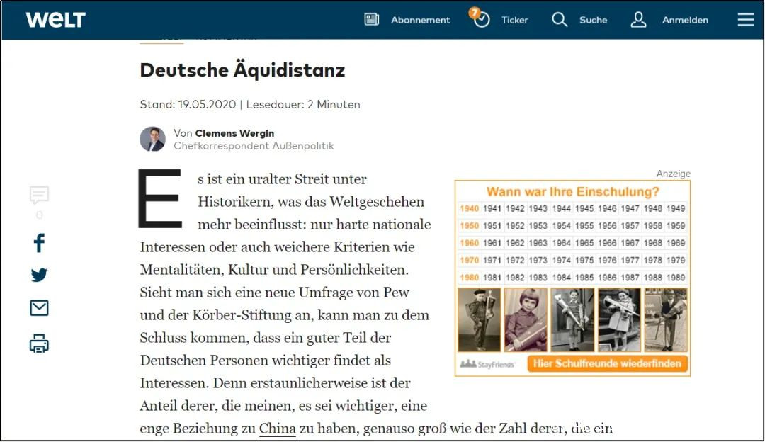 據《德國之聲》中文網的報道,《法蘭克福匯報》的國際政治版主編弗蘭肯貝格爾針對這一調查結果,發表了署名文章《德美、德中等距?你們是認真的嗎?》。