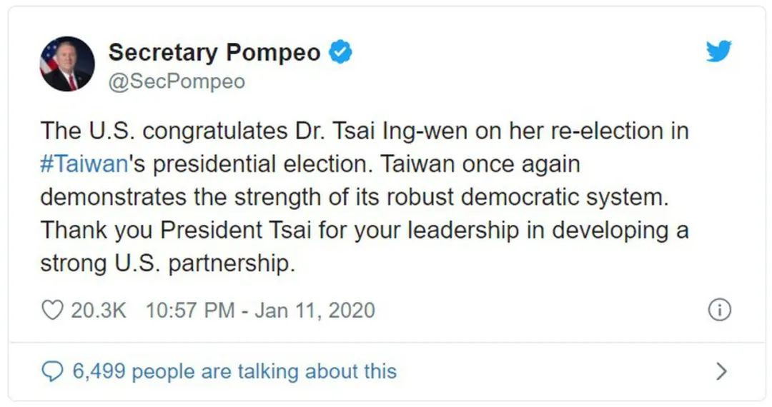 蓬佩奧在這份聲明中稱,“充分彰顯美國對台美關係的重視、對台灣民主的鼎力支持,也反映台美關係的高度互信友好”。