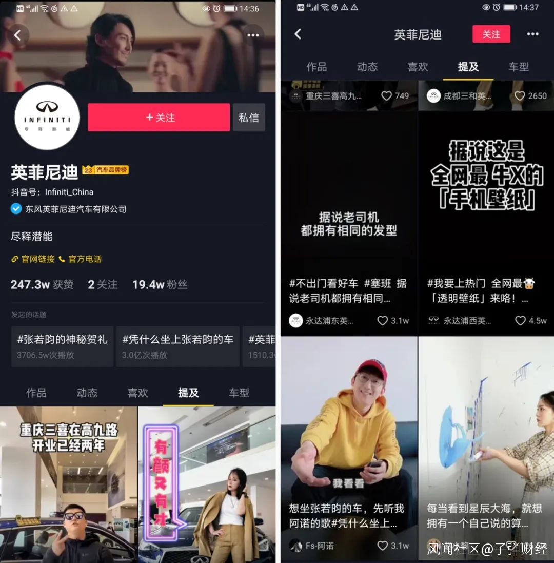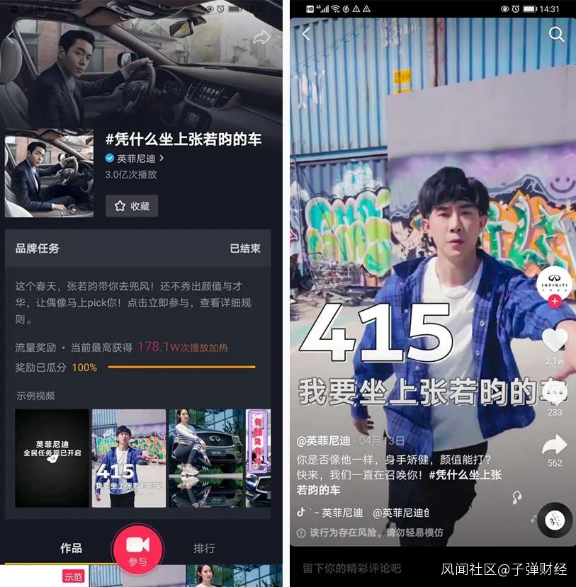 捲入大量達人蔘與挑戰賽的短視頻創作後,“415我要坐上張若昀的車”成為二次傳播梗,結合挑戰賽、達人視頻和用户自發參與,為直播當日活動積攢大量關注。同時,挑戰成功的二位達人也獲得英菲尼迪助力,上直播“直面”張若昀。