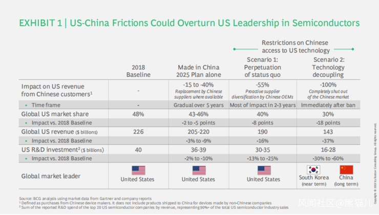 近日,美國波士頓諮詢公司發佈了一份題為《限制對華貿易將如何終結美國在半導體行業的領導地位》(How Restricting Trade with China Could End US Semiconductor Leadership)的研究報告。(以下簡稱《報告》)《報告》預判了中美貿易摩擦在芯片領域的兩種可能走向。指出如果美國持續加大對中國的商用芯片出口管制力度,美國半導體公司的競爭力將會被削弱,美國在半導體領域的長期領先地位會受到威脅,對美國半導體產業帶來深遠的負面影響,甚至遠超"中國製造 2025 “政策的預期效果。