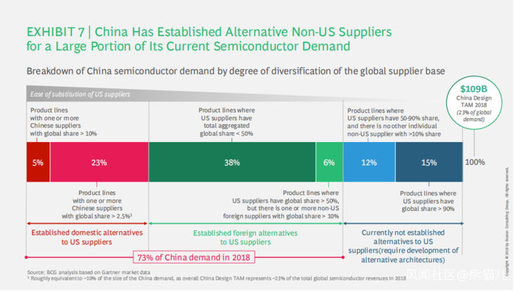在需求上,中國目前佔全球半導體需求的 23% 。這意味着,美國半導體公司僅佔中國終端設備製造商總需求的 14% 。
