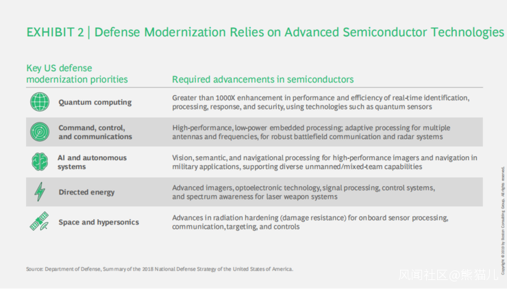 半導體工業起源於 20 世紀 50 年代的美國國防工業。 雖然美國國防部( DoD )目前約佔該行業收 入的1%,但電子部件在國防和武器系統中無處不在,因此對美國的軍事能力仍然至關重要。 在 2018 年美國國防戰略中提出的國防現代化優先事項包括微電子、5G 和量子科學作為需要美國投資的戰略領域。 其他優先領域-如網絡安全、人工智能、自主系統和先進的成像設備也嚴重依賴先進的半導體能力。