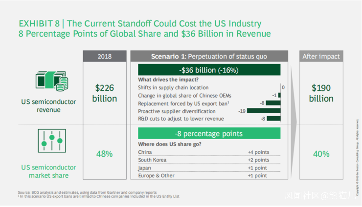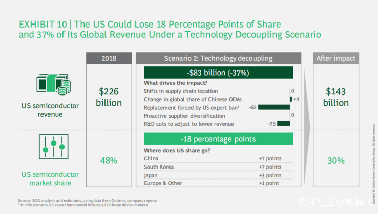 美國公司如果繼續遵守現行《實體名單》所規定的限制,則將失去 8% 的全球份額和 16% 的收入;如果美國完全禁止半導體公司向中國客户出售產品,那麼全球市場份額將損失 18% ,其收入將損失 37%,這實際上將導致技術與中國脱鈎。