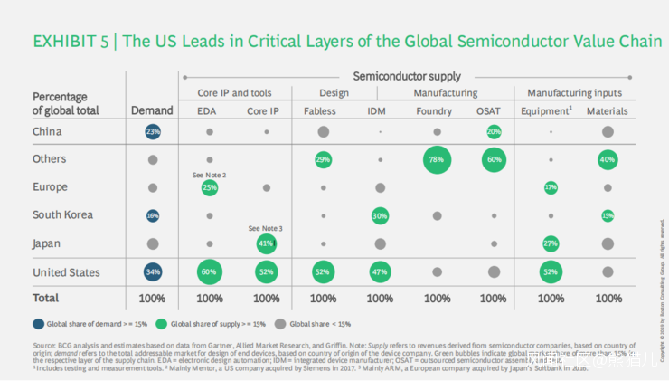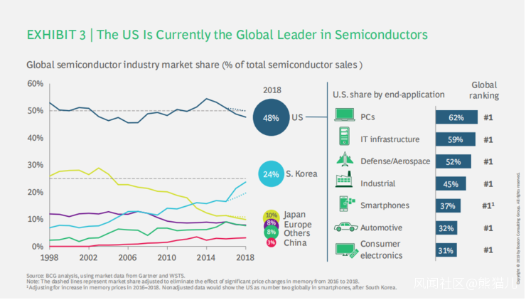 此外,根據 Gartner 的數據,2018 年美國半導體公司(包括在自己的工廠中設計和製造產品的集成設備製造商(IDM),以及依靠獨立代工廠製造其芯片的無晶圓廠設計公司)在全球半導體市場中提供了約 48%的份額。而在從 PC 和 IT 基礎設施到消費電子產品的所有最終應用市場中,美國在 32 種半導體產品類別中的 23 種中均處於領先地位。