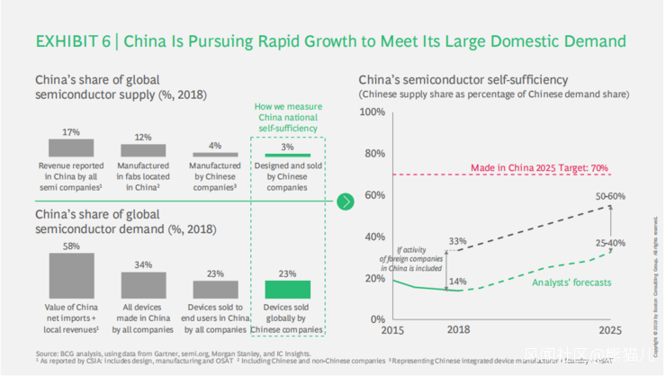 據此,波士頓估計,“中國製造 2025 ”計劃將使中國半 導體自給率到 2025 年提高到 25% 至 40% 左右,使美國的全球份額降低 2 至 5 個百分點。