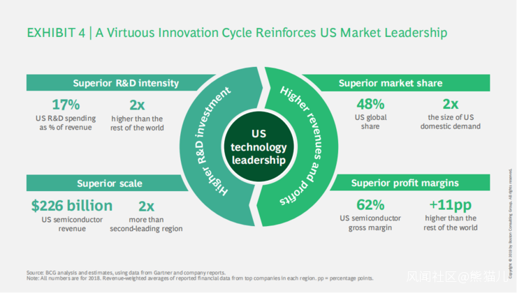 在數字轉型和人工智能時代,強大的半導體工業對美國的全球經濟競爭力和國家安全至關重要。而美國 一直是全球國家半導體領導者,佔據 45% 至 50% 的份額。並且美國的領導地位建立在一個良性的創新循環中,這種循環依賴於進入全球市場的機會,以達到為持續保持美國技術領先於全球競爭對手的大量研發投資提供資金所需的規模。