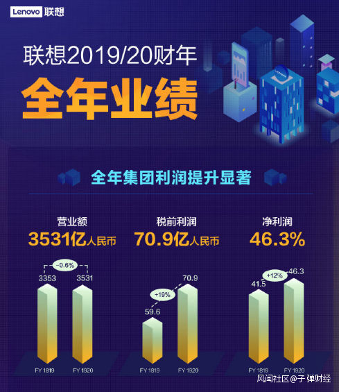 5月20日,聯想集團發佈2019/2020財年Q4及全年報。2019年3月31日至2020年3月31日,聯想全年總營收3531億人民幣,税前利潤70.9億人民幣,同比增長19%,創歷史新高。