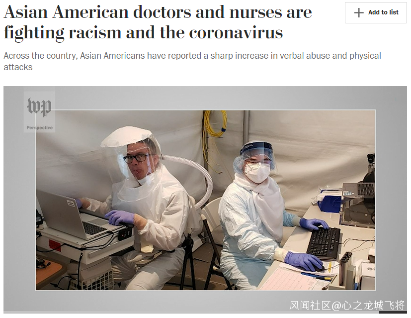 0人蔘與0評論《華盛頓郵報》昨天的一篇報道《美國亞裔醫護正在同時與種族主義和新冠病毒戰鬥》揭露令人寒心的現實:全美針對亞裔的騷擾、辱罵、攻擊等仇恨事件正在激增。即使在戰鬥在新冠抗疫一線的亞裔醫護人員,也不能倖免。他們不僅在冒着危險辛勤工作一天後的下班路上受到過攻擊,甚至在病房遭到病人的言語,乃至唾沫的攻擊。