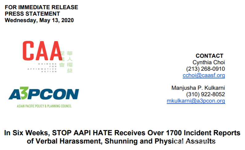 5月13日發佈的報告稱,6星期已記錄1700多起反亞裔的騷擾事件報告。