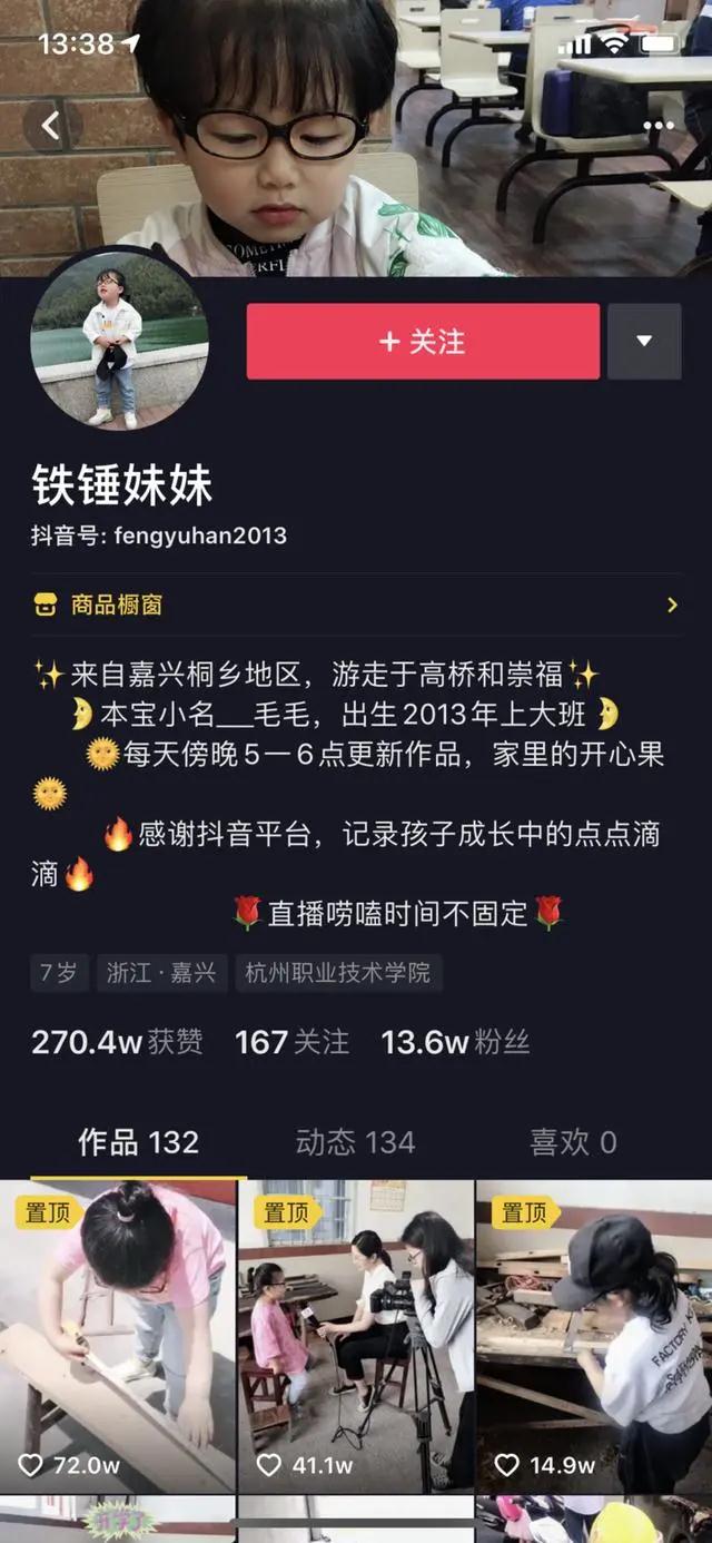 從那以後,“鐵錘妹妹”的粉絲每天都在增長,直到今天早上9點,錢江晚報小時新聞記者第一次打開,顯示粉絲數有13.2萬,一個小時後就達到了13.4萬,到了下午1點已經達到13.6萬。