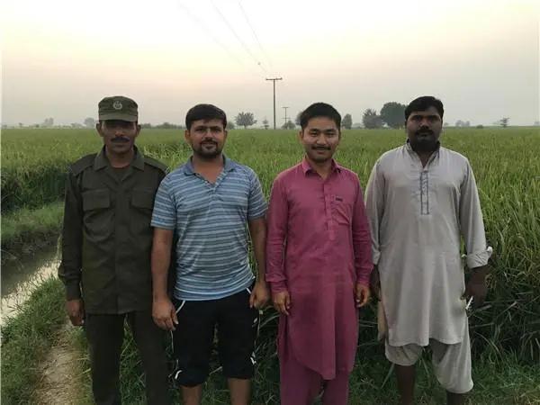 在巴基斯坦推廣雜交水稻的代英男(左一)。圖 / 受訪者提供