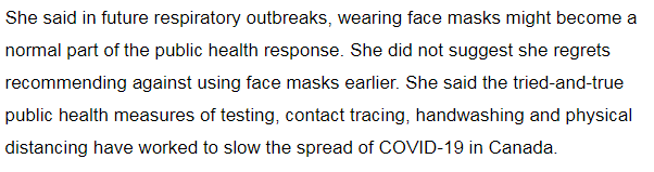 但她並不後悔沒有早點建議民眾使用口罩,因為真正有效的依然是測試、接觸者追蹤、洗手和社交距離這些已經被證明行之有效的方法。