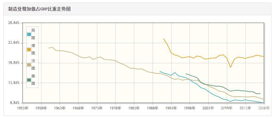 隨着經濟的發展,一國產業結構往往會轉向以服務業為主,對製造業的依賴逐漸降低,這就是所謂的製造業空心化。