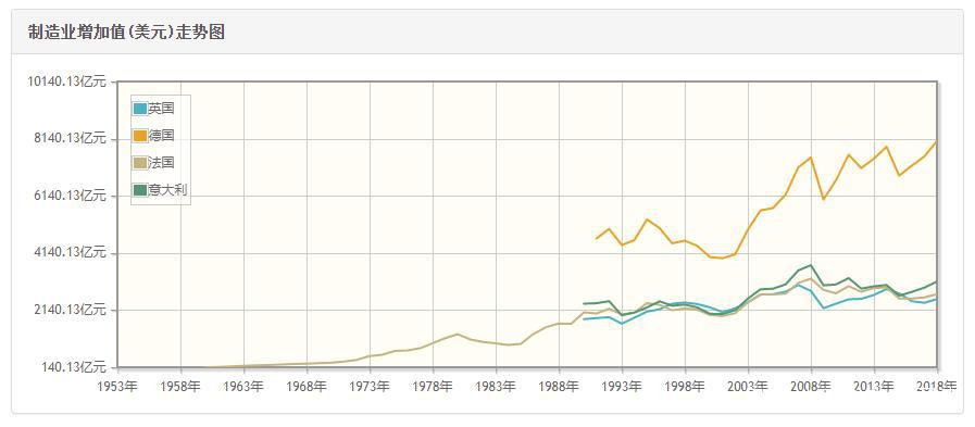 2018年,德國的製造業增加值為8054.58億,是英國、法國、意大利的2倍。