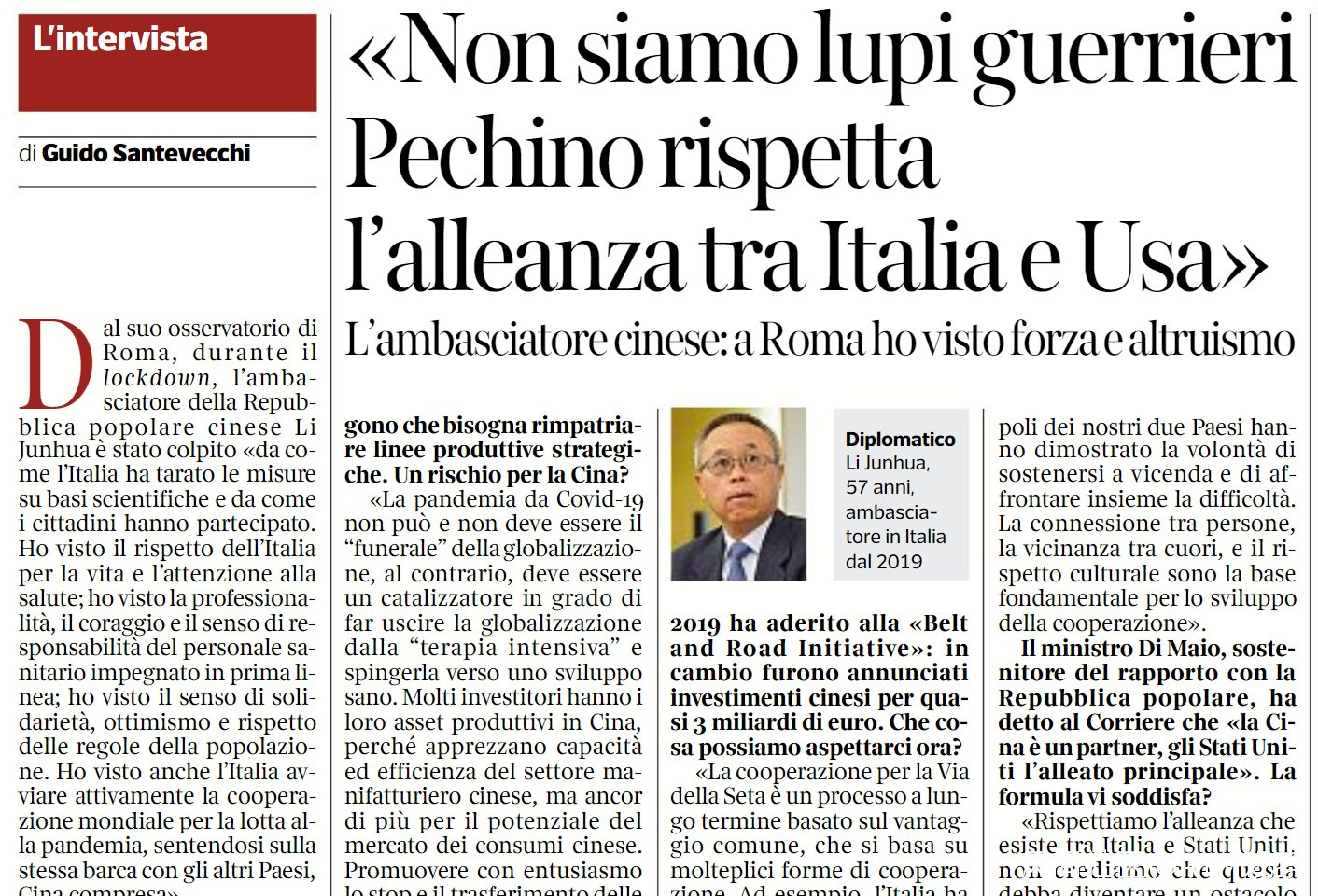 當地時間5月20日,駐意大利大使李軍華就意新冠肺炎疫情等問題接受意《晚郵報》採訪。