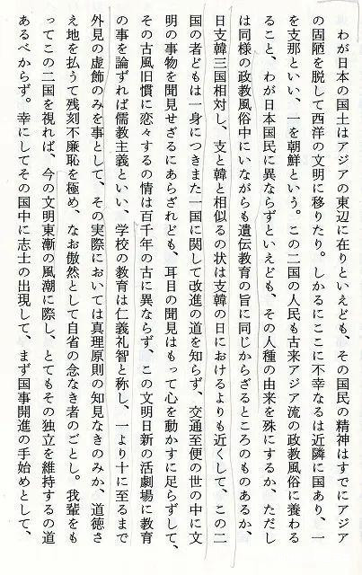 於是日本發生了一次激烈的討論:日本應該脱離亞洲擁抱西方,還是留在亞洲做亞洲的主宰者?宣稱脱離亞洲這一主張的説法,被稱為“脱亞論”。其中最為著名的論斷來自一篇刊登於《時事新報》的匿名文章。