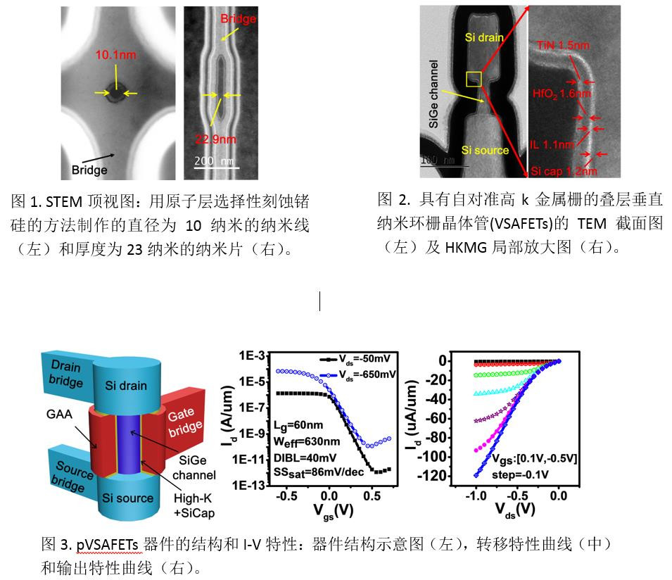 朱慧瓏課題組系統地研發了一種原子層選擇性刻蝕鍺硅的方法,結合多層外延生長技術將此方法用於鍺硅/硅超晶格疊層的選擇性刻蝕,從而精確地控制納米晶體管溝道尺寸和有效柵長;首次研發出了垂直納米環柵晶體管的自對準高k金屬柵後柵工藝;其集成工藝與主流先進CMOS製程兼容。課題組最終製造出了柵長60納米,納米片厚度20納米的p型VSAFET。原型器件的SS、DIBL和電流開關比(Ion/Ioff)分別為86mV/dec、40mV和1.8*105。