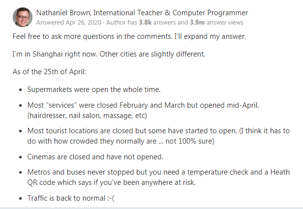 到4月1日,所有人的生活基本都恢復了正常。那天我們小區所有的門都重新打開了(在這之前只有一個門可以通行,這樣他們檢查進出人員會更容易)。人們仍然戴着口罩,但從這天起,口罩使用率可能會降到70%。