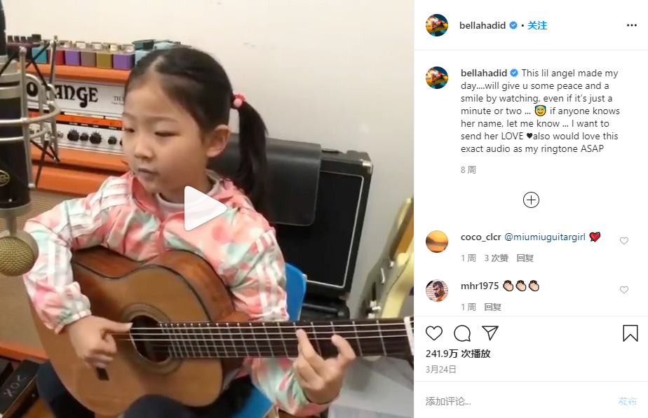 Miumiu的吉他彈唱還引來了美國模特、前維密超模Gigi Hadid的關注↓