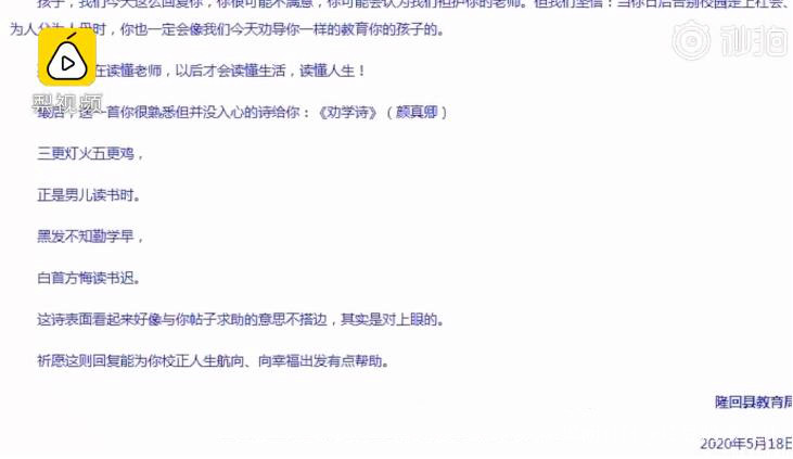 而據瞭解,隆回縣教育局知悉此事後,也通過相關平台發佈短文回覆發帖學生。