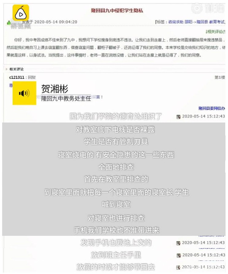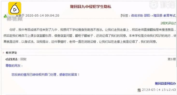 據瞭解,發帖學生稱,自己中考成績不佳故而來到隆回九中。他在帖子中提出質疑,學校“強行”徵得同意對學生的課桌椅和寢室進行搜查是否合法,“本來學校是交(教)給我們知識的地方,結果就是這樣,以身試法……”