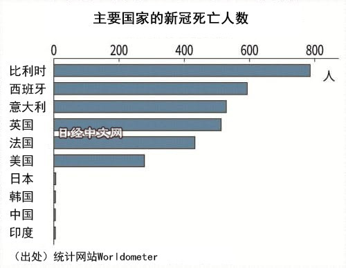 統計網站“Worldometer”截止到5月19日的報告顯示,每100萬人中死亡人數最多的國家是比利時(786人)和西班牙(593人)。其後是意大利、英國、法國等國家。而首先發現感染病例的中國僅為3人。日本為6人,韓國為5人,印度則只有2人。