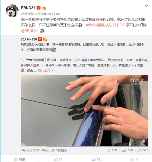 日前,前中國追風小組核心成員、氣象工程師 知名科學科普博主@天師-卡贊 在微博放出一段實拍視頻,展示了特斯拉Model 3的天窗做工細節以及短板,並給出了自己的購買建議。