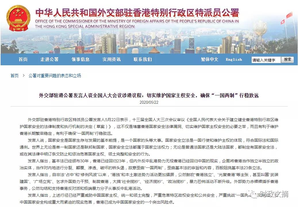 據外交部駐港公署網站消息,外交部駐香港特別行政區特派員公署發言人5月22日表示,十三屆全國人大三次會議審議《全國人民代表大會關於建立健全香港特別行政區維護國家安全的法律制度和執行機制的決定(草案)》,這不僅是堵塞香港國家安全法律漏洞、切實維護國家主權安全的必要之舉,而且有利於維護香港長期繁榮穩定,有利於確保“一國兩制”行穩致遠。