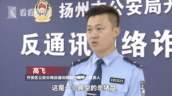 揚州市開發區公安分局反通訊網絡詐騙中心負責人高飛表示:“獲取受害人進一步的信任之後,會不斷讓受害人加大投資額,當達到嫌疑人投資的預期或超過預期之後,就會及時的提現走人,甚至直接與受害人斷絕聯繫,也就是我們所説的把豬養大之後宰豬的一個過程,這是一個典型的殺豬盤。”