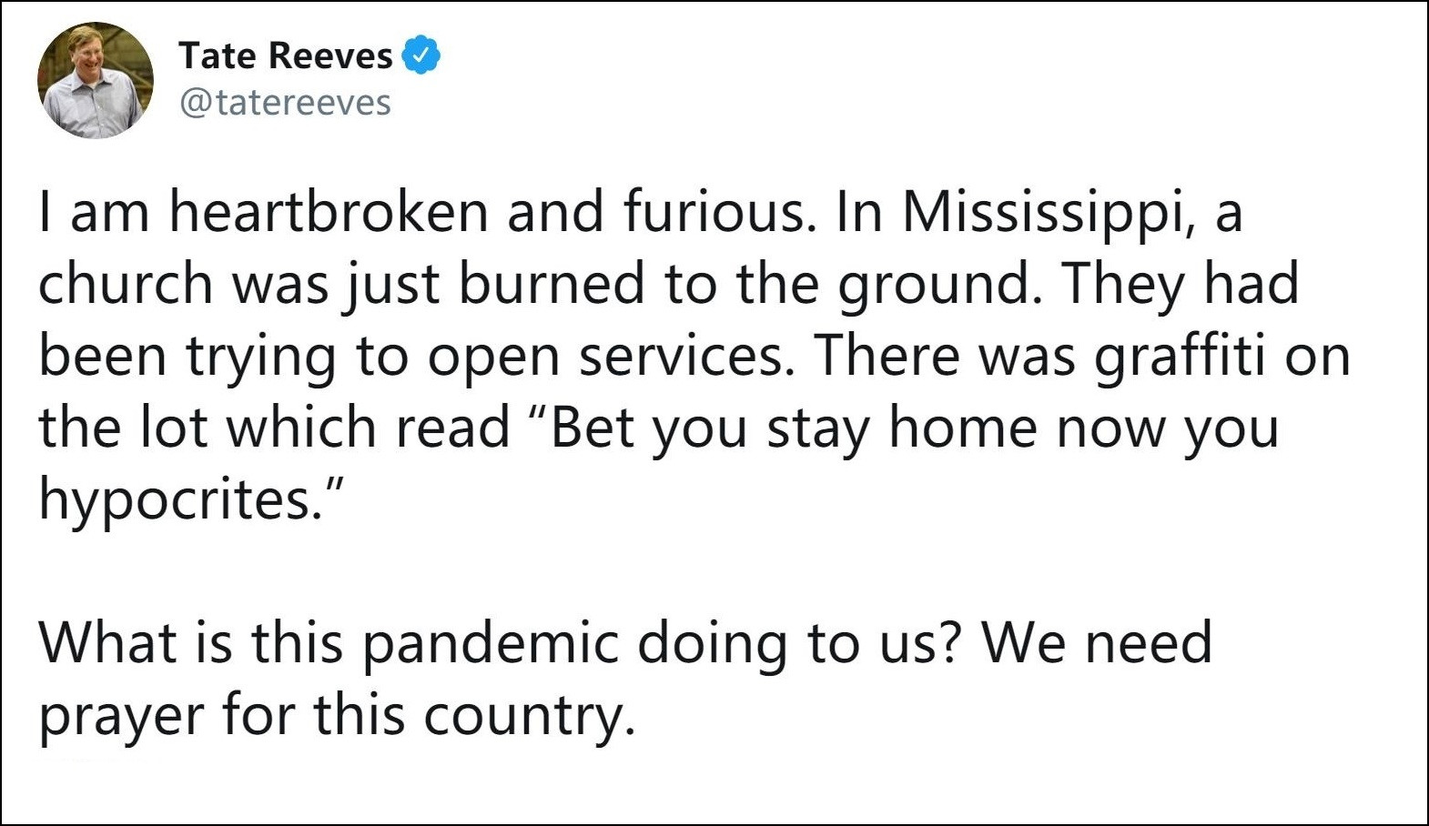 對於教堂被焚燬一事,密西西比州的州長泰特·裏夫斯週四晚間發推文稱:“我傷心欲絕,在我執政的密西西比州,一座教堂被堂而皇之地燒燬了,而這座教堂此前堅持開放……疫情大流行對我們做了什麼?我們需要為這個國家祈禱啊。”