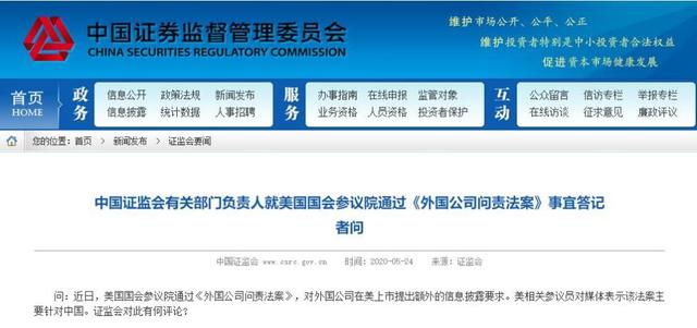證監會回應美《外國公司問責法案》:堅決反對證券監管政治化_風聞