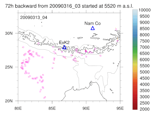 我們通過一些模式的計算就發現在喜馬拉雅的南部,風的驅動作用能把這些污染物送到峽谷,再傳輸到青藏高原。這個模擬圖非常直觀,可以看到這些污染物首先在南部聚集,然後發生抬升,最後順着峽谷傳輸到青藏高原的內陸。