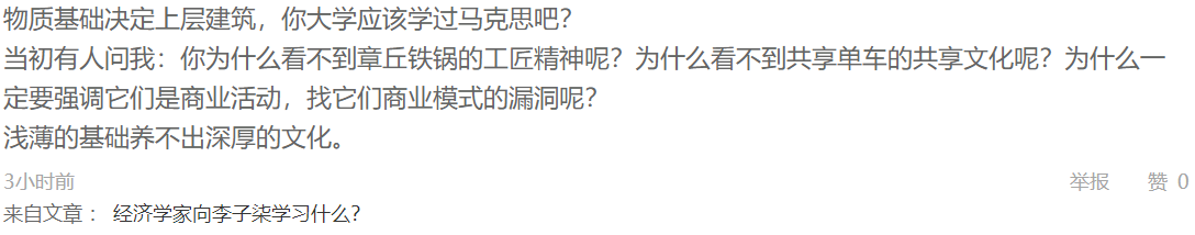 其次,有人説:“如果説李子柒是網紅的營銷手段厲害,人家也是營銷了勞動光榮,生活努力,自給自足……等等,這是一種生活態度,嚮往美好生活的境界,能喚醒被金錢權勢過度支配的心的方向!”這是一種很有代表性,也很有迷惑性的言論。問題出在哪裏?脱離了物質基礎談上層建築,只談美好的概念,避而不談錢來自何處,這是資本欺騙人民的經典話術。如果説共享單車是網絡營銷厲害,人家也是營銷了運動、綠色、低碳、環保、共享等等,這是一種生活態度,嚮往美好生活的境界,能喚醒被金錢權勢過度支配的心的方向!